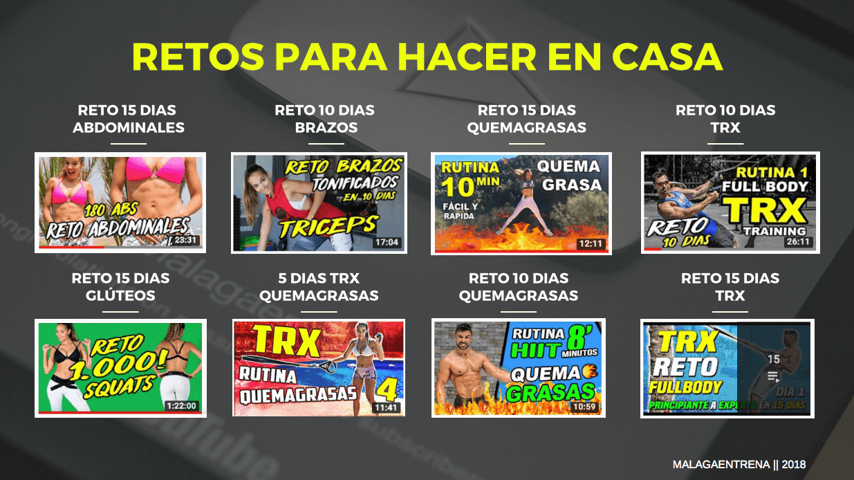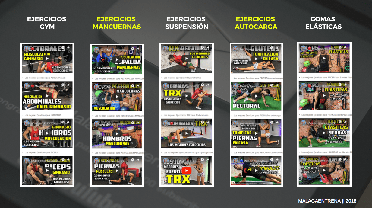 - Más de 50 Tutoriales con más de 500 Ejercicios en video (En Gimnasio, con TRX, Gomas Elásticas, Autocarga)
